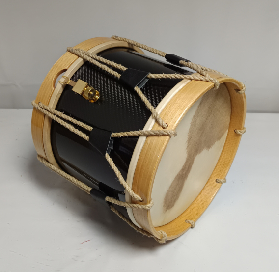 Realizados en caja de madera de abedul o okume, aros de haya, bordón de tripa de cerdo, parches piel.Diámetro 25.4cm altura 30cm